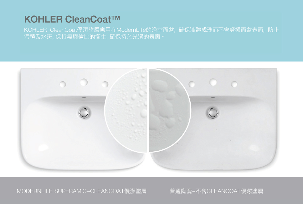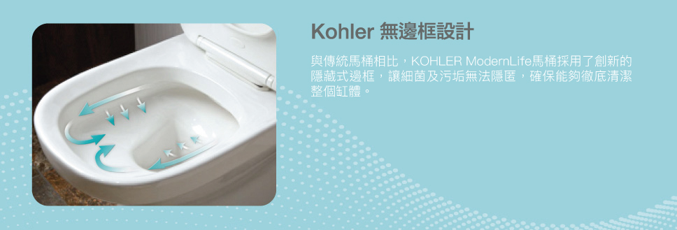 KOHLER應用於ModernLife坐廁缸體內部的抗菌釉, 是一種具有殺死細菌能力的創新技術。抗菌釉不是表面塗層, 而是在燒製過程之前內置於缸體的陶瓷中, 長期有效地防止細菌, 實現最佳的衛生。